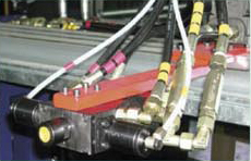 聚氨酯組分原料經過連續(xù)高壓發泡機的計量泵精密計量後,按照一定配比,被送入混合頭均勻地布料在複合板的底層麵材上,並和上(shàng)層麵材同時被送入雙履帶(dài)層壓輸送機,聚氨酯泡沫在(zài)雙履帶層壓(yā)輸送機的上下輸送鏈板間發泡(pào),並固定成型。待固(gù)定(dìng)成(chéng)型後,複(fù)合板在生產線上被自動跟蹤,切斷(duàn)機按需切成一定長度(dù)的成品。